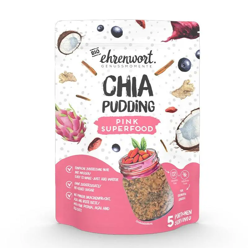Ingrediente: Semințe de chia*, pudra de curmale*, 10,8% pudră de băutură de OVAZ (făină de OVAZ integrală*, sare evaporată)*, 5% goji*, fulgi de cocos*, 1,2% mix de condimente superfood roz (45% pudră de sfeclă roșie*, praf de scorțișoară Ceylon*, praf de scorțișoară*, 5% praf de scorțișoară* pudră de acai*, 3% pudră din fructe de dragon roz*)