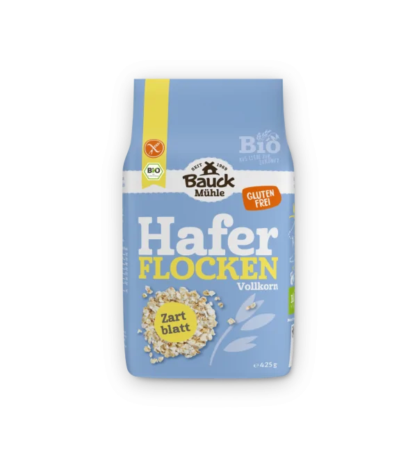 Fulgi de ovăz BIO fără gluten Bauckhof, ideali pentru mic dejun sănătos, terciuri nutritive și rețete echilibrate.