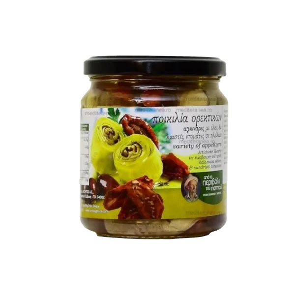 Ingrediente: anghinare, rosii uscate la soare, masline kalamata, ulei de floarea-soarelui, otet, patrunjel, sare.