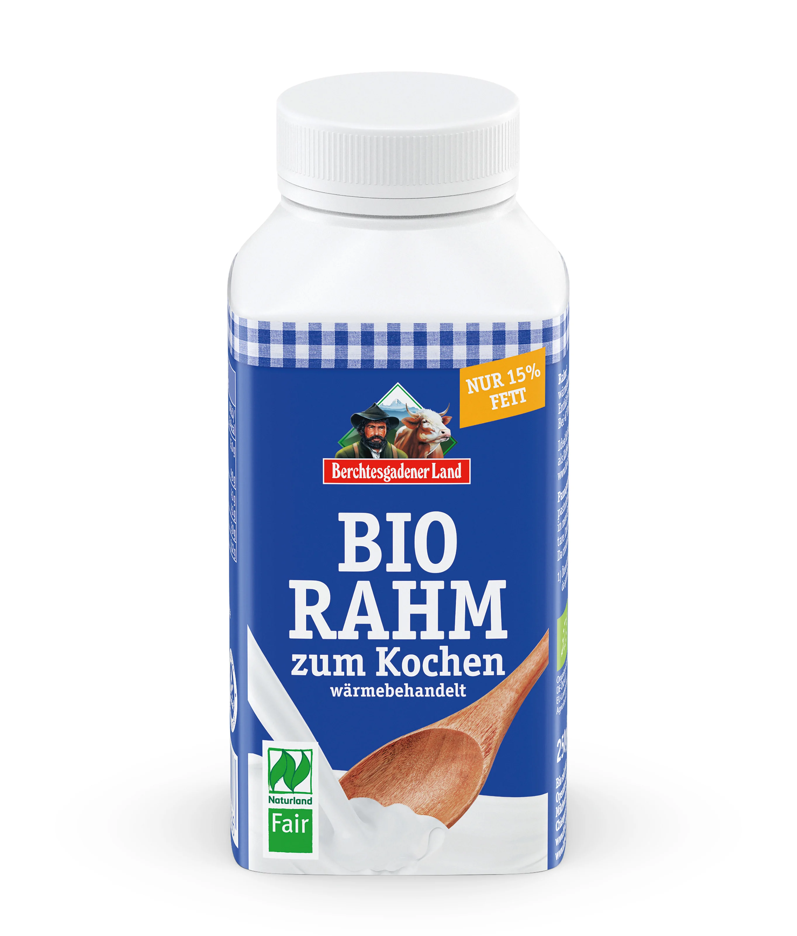 Smântâna BIO pentru gătit de la Berchtesgadener Land este obținută din lapte ecologic de cea mai bună calitate, provenit de la vaci crescute pe pășuni alpine, hrănite natural și cu grijă pentru bunăstarea animalelor.